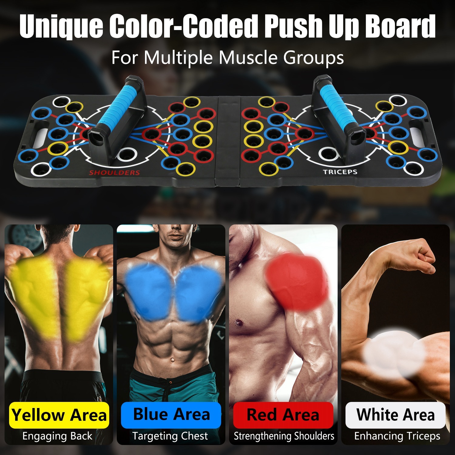 - *Unique Color-Coded Push Up Board*: Design with color-coded system,our foldable push-up board provides a wide range of efficient push-up positions,allowing you to train different muscle groups by changing handles positions,yellow for engaging the back,red for strengthening the shoulders,white for enhancing the triceps,and blue for targeting the chest. Innovative design not only simplifies your workout routine but also significantly improves workout efficiency.
